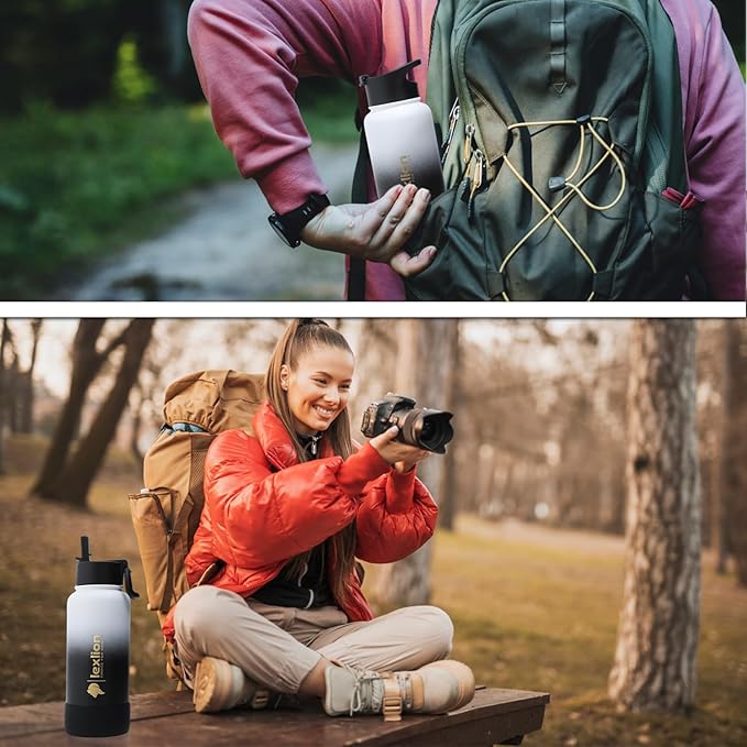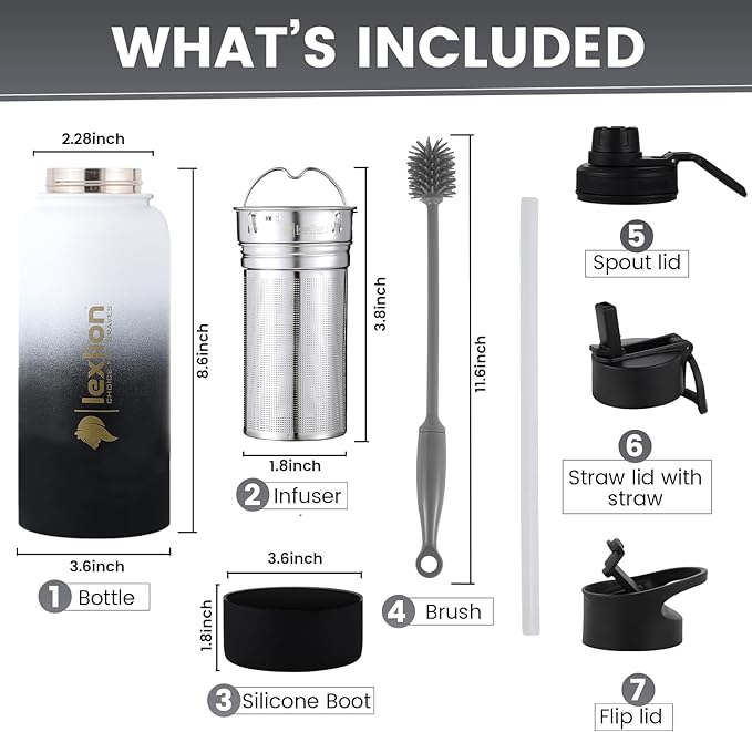 - ✅ LIDS & INFUSER/STRAINER- Lexlion water bottle 32 oz comes W/3 LIDS! a spout lid, a flip lid & and a third lid which is straw lid ( for new version) or stainless steel lid ( for old version), 100% leak-proof & dishwasher safe. It includes a newly designed 2-piece strainer stainless steel, a very convenient filter to make loose tea leaves, cold coffee brews, herbs, or fruit-infused water. Add them to the filter basket, close it & clip in with water. If an infuser is not needed, remove it.
