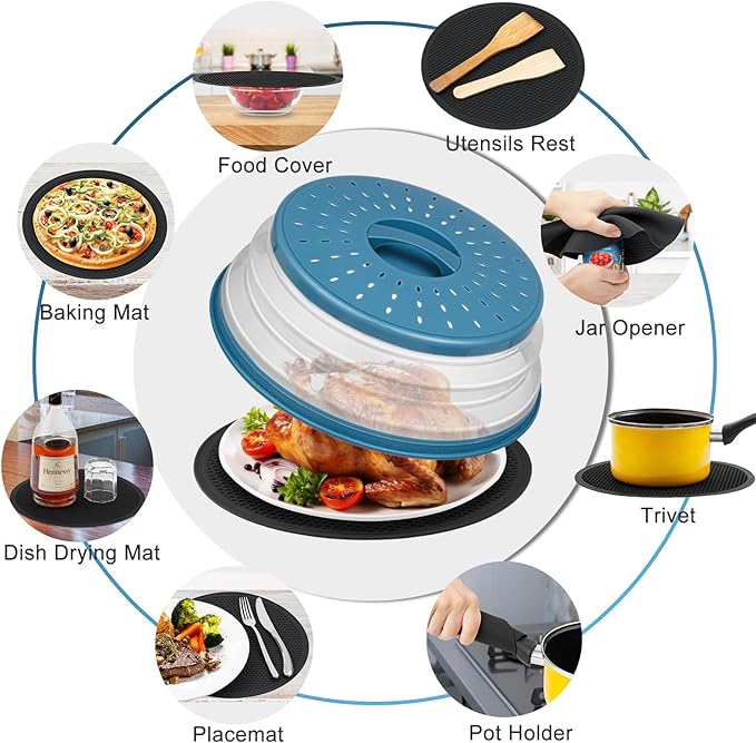 - 1 Microwave Cover & 1 Mat:10" Mat as bowl holder and 10"cover as splatter guard,not only keep your microwave clean but also can prevent burns.They are the perfect match in a home microwave