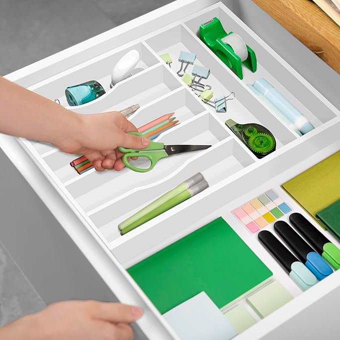 - π§½ππππ ππ πππ, πππ πππππππππππ: Super easy to use, simply set the Royal Craft Wood Cutlery Tray with Drawer Organizers in your clean, empty drawer and fill with anything youβd like from kitchen utensils such as spoons, forks, tongs, spatulas, or steak knives to desk essentials like your stapler and staple refills, paper clips, erasers, and more. Easy to maintain, all you need to do is wipe clean with just a damp cloth, and your silverware drawer organizer will be as good as new