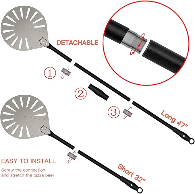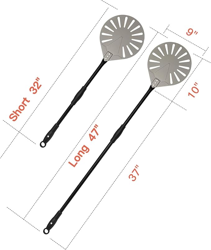 - 【Long Handle】The 47-inch (120 cm) aluminum turning pizza spatula allows you to easily rotate your pizzas, breads, or pies in hot ovens. The 37-inch long handle and sliding grip design solve the problems of unsafe use, looseness and easy slipping during baking