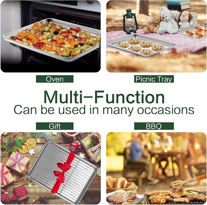 - Excellent Crafted & Heavy Duty : The baking tray with wire rackt comes with sturdy construction and reinforced edge, which is prevent twisting and warping and heat up evenly reducing baking time. The baking pan has an excellent mirror polished, reducing the risk of food adhesion. The smooth edge of baking tray won't cut your hand.