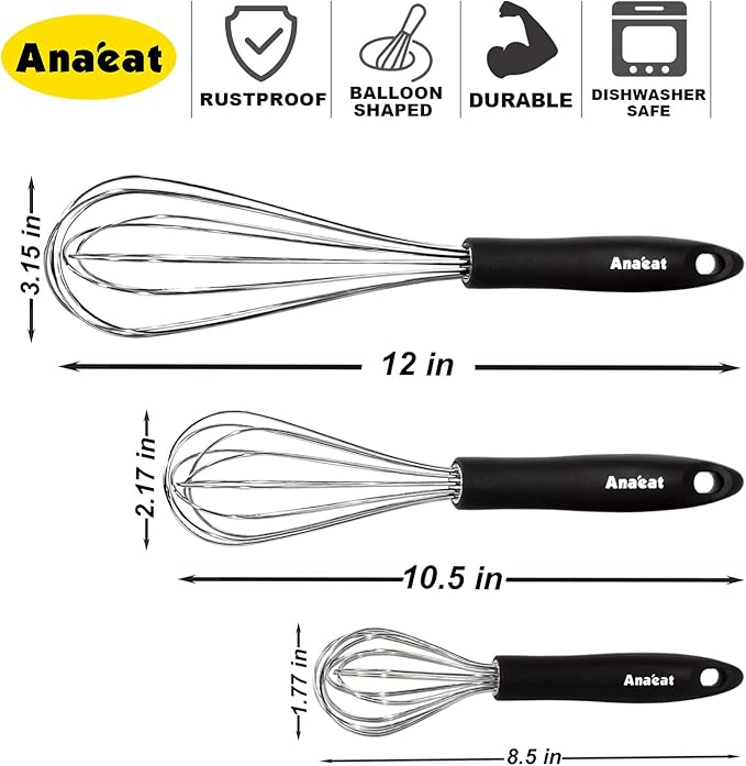 - 【BRAND QUALITY GUARANTEE】QUALITY CAN SPEAK ITSELF. Anaeat focuses on kitchenware research and development. We are so confident that we have the best Stainless Steel whisk set on the market. If you have any problems with Anaeat products, feel free to send us a message by Amazon and we resend to you right away for free, or full money back. We are very concerned about every order, and try our best to Provide our customers with HEALTHY & DURABLE kitchen accessories.