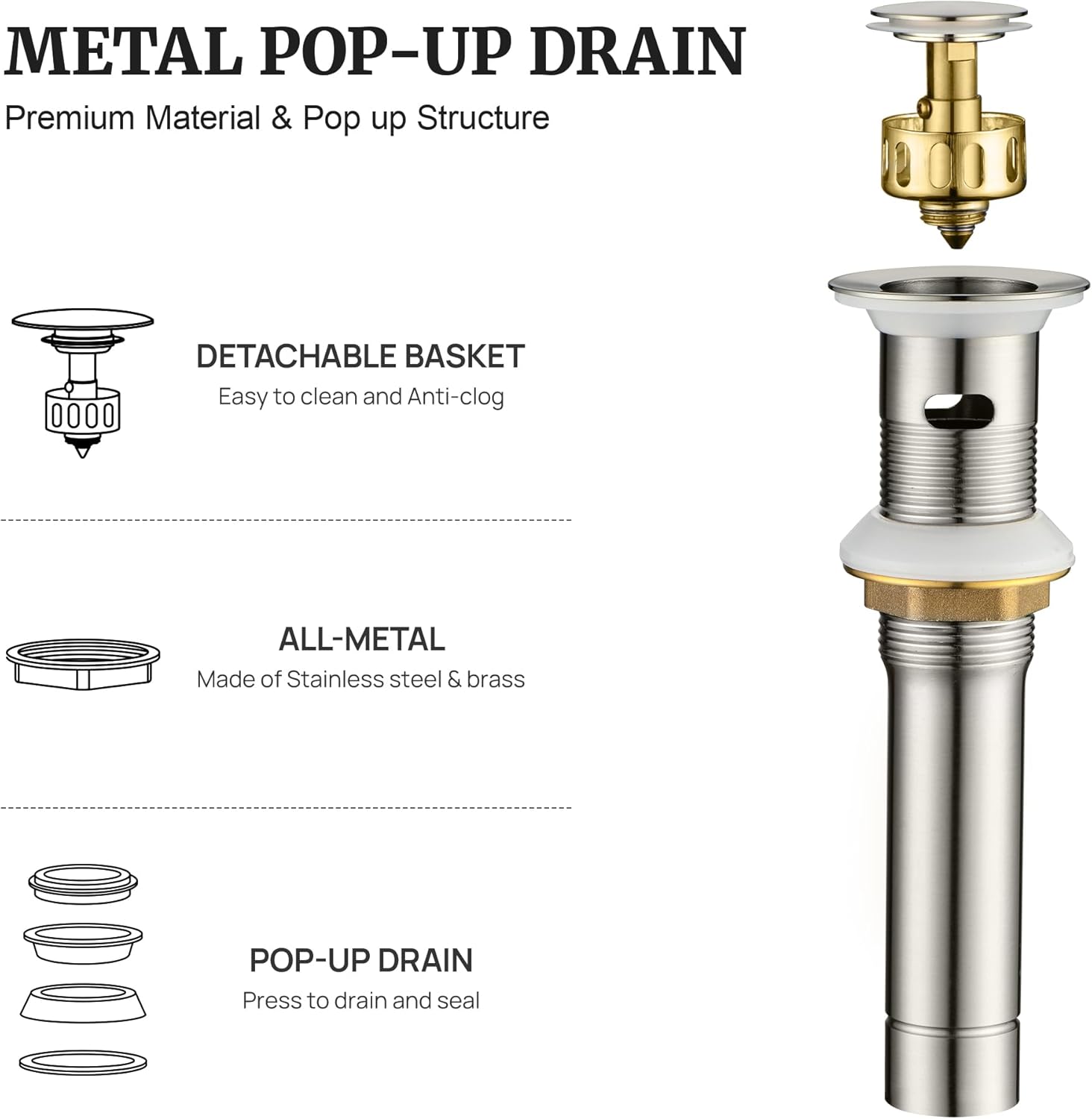 - HIGH QUALITY: Metal quality sink drain stopper for you, It is well made of high quality brass and stainless steel, all of the accessories are of the highest quality