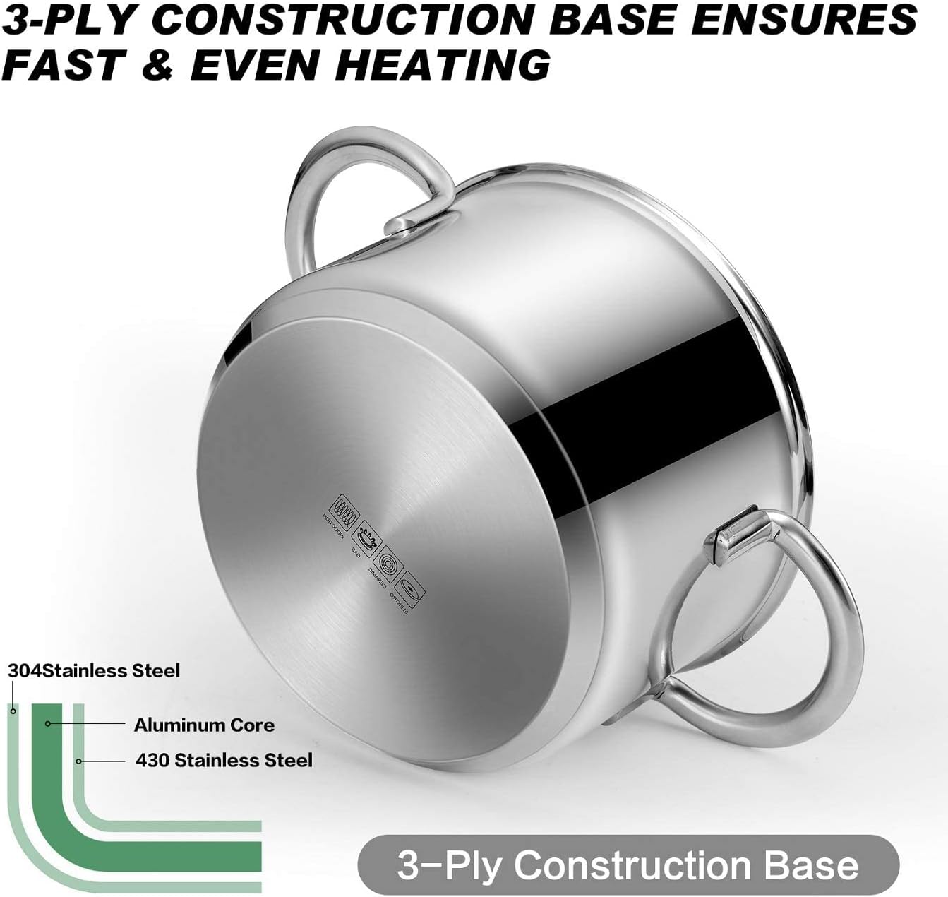 - Heavy-Duty Tri-Ply, Full-Clad: Reinforced 3-layer (SS/Al/SS) Body and Base for stability, even heat, and long-lasting durability without warping. Strong riveted construction for lasting durability and safe handling.