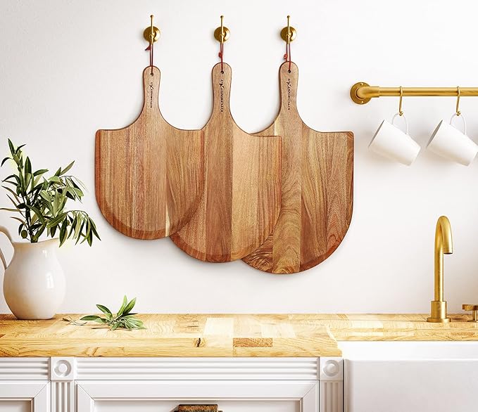 - Premium Acacia Wood: Crafted from durable acacia wood, known for its natural resistance to moisture and cracking. Its beautiful grain adds elegance to your kitchen while ensuring long-lasting use for pizza peels and paddles
