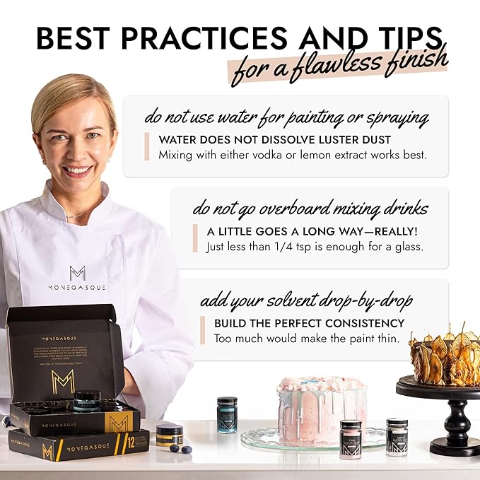 - EASY TO USE: Our white luster dust is incredibly versatile. Apply with a wet brush, airbrush, or dry brush, and even mix into beverages. Achieve professional-looking results effortlessly at home, whether decorating halloween cakes or adding shimmer to cocktails.