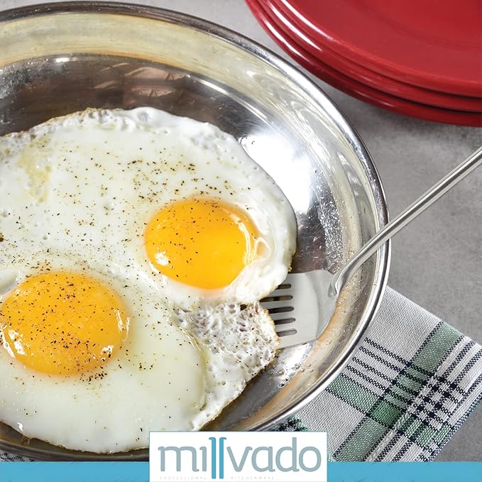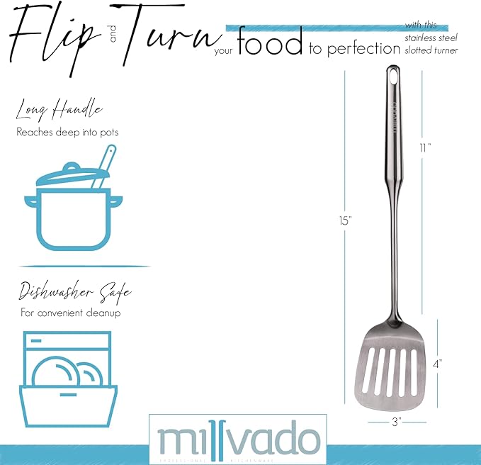 - THIN, YET STURDY: This stainless-steel spatula has a thin enough edge to easily slide under pancakes, omelets, or the like, yet it’s sturdy and will provide long-lasting durability. It has an ergonomic rounded handle, too, which won't cut into your hand while using. It's one of those spatulas you'll be glad you added to your kitchen tools collection!
