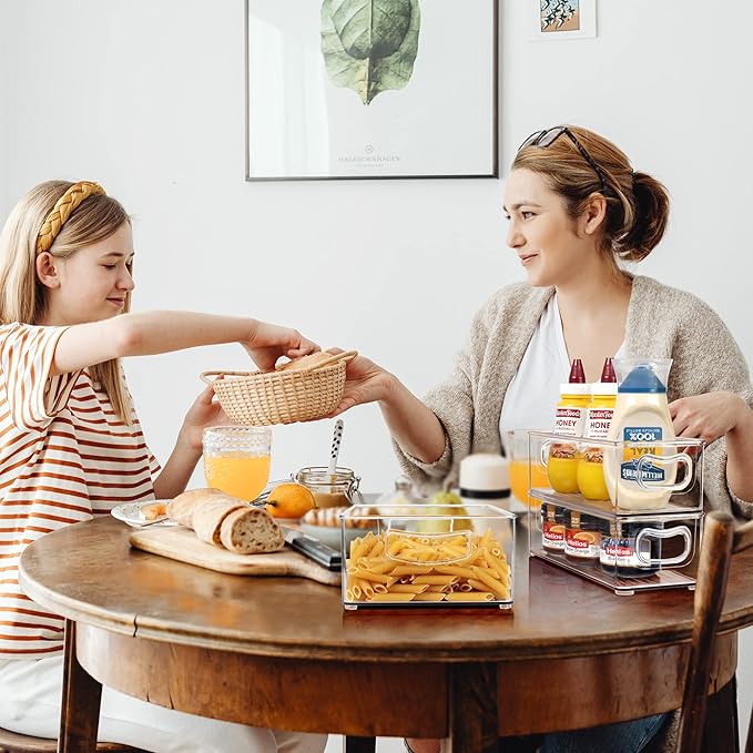 Hudgan 8 PACK Stackable Pantry Organizer Bins (3 sizes) - Clear Fridge Organizers for Kitchen, Freezer, Countertops, Cabinets - Plastic Food Storage Container with Handles for Home and Office