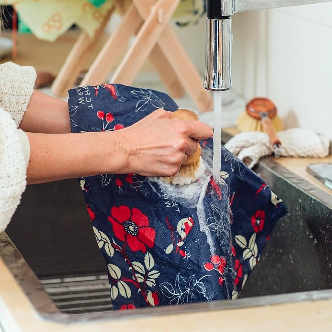 - BEESWAX WRAPS FOR FOOD in 3 sizes: small (7" x 8"), medium (10" x 11"), and large (13" x 14"), all featuring a colorful floral design. Made in USA reusable beeswax food wraps are sustainable products & a great alternative to single use plastic wrap, sandwich wraps, and aluminum foil.