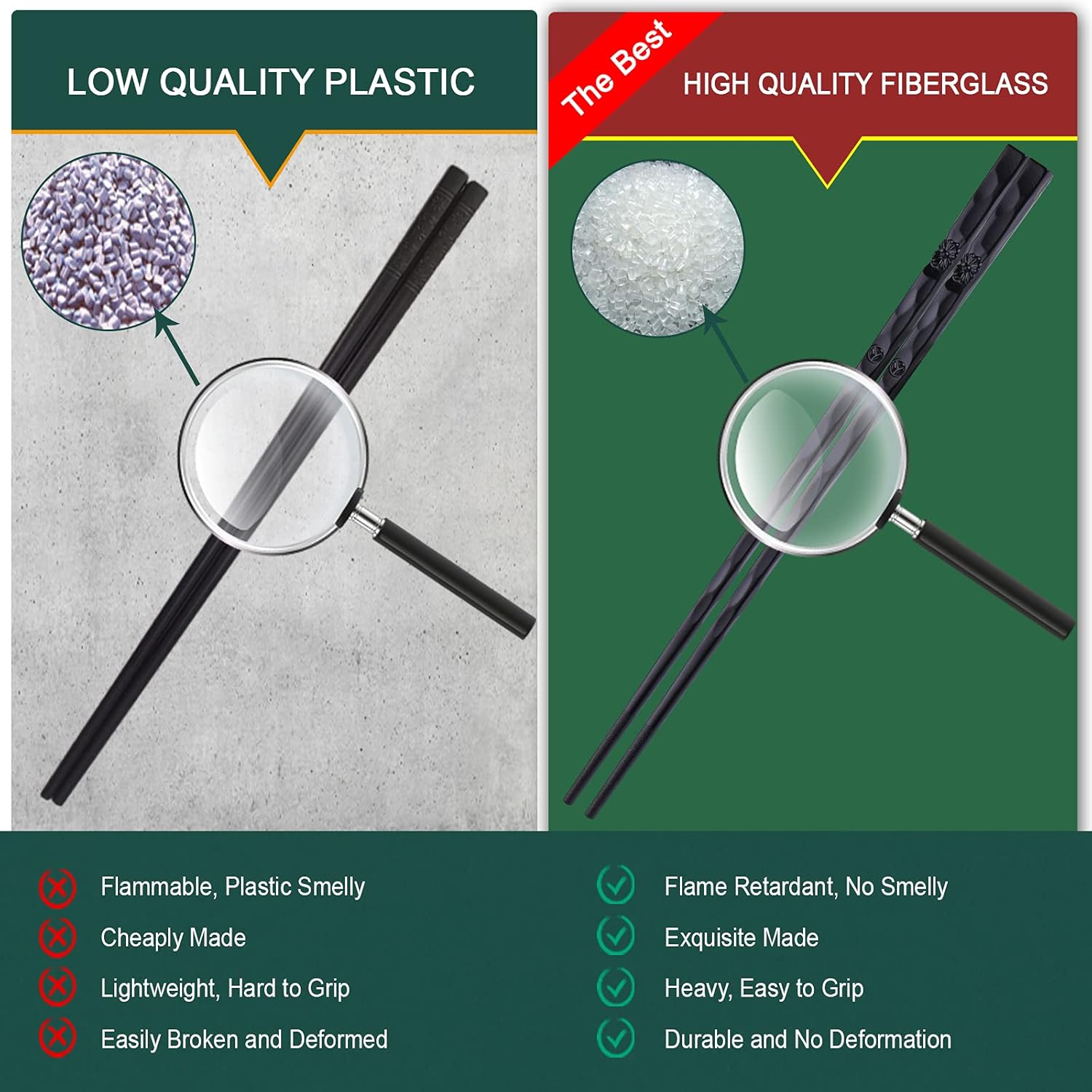 - Healthy & Safe: Glamfields chopsticks are made from high-quality heat-resistant fiberglass material, which avoids the metallic taste of metal chopsticks, the burr of wooden chopsticks, and the unhealthy quality of plastic chopsticks, it is BPA-Free, no coating, no paint, comply with the most rigorous food-contact standards over the world, Safe for daily use.