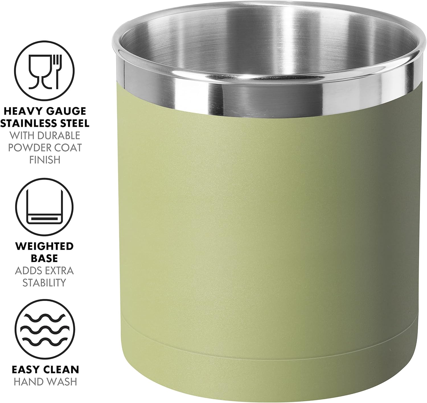 - GREAT VALUE: Utensil holder is 7" in diameter with a height of 6.5". BPA-free, non toxic, chemical and lead-free. The beautiful powder coated color finish is trimmed with a mirror band working well in any kitchen design. Color - Olive.