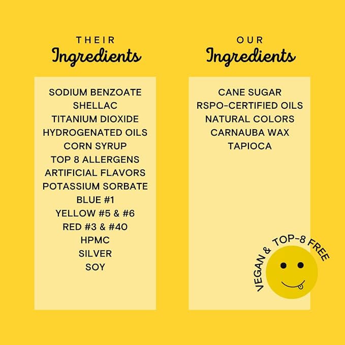 - NO CONFECTIONER’S GLAZE: Did you know most sprinkles get their shine from bug goop? We keep it vegan with a formula that’s friendly to all creatures, big and small.