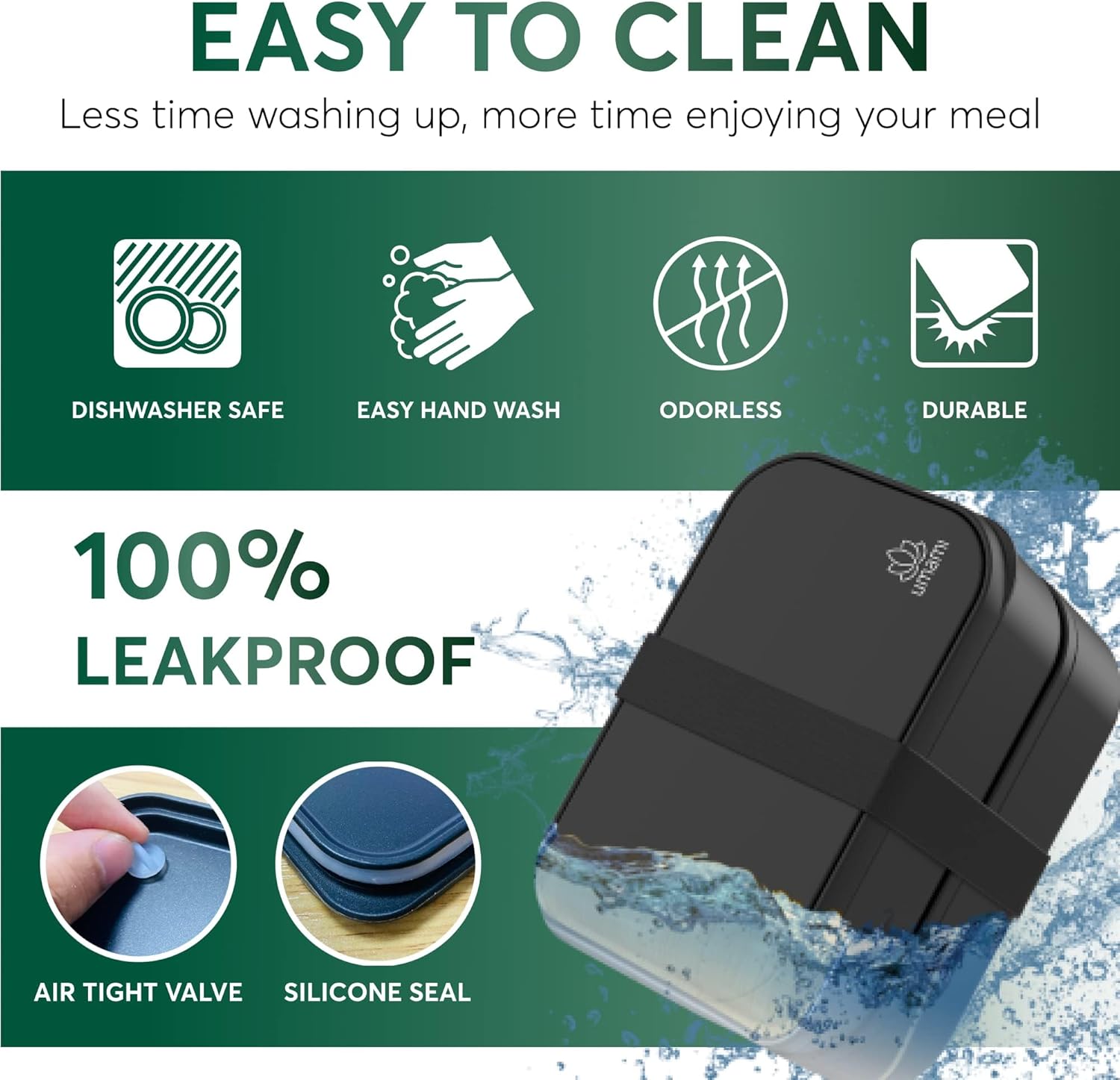 Umami Bento Box Adult All-In-1 w/4 Utensils, 2 Sauce Jars 2 Dividers,100% Leakproof, Microwave & Dishwasher Safe Stackable Bento Lunch Box Containers for Men/Women, Black, 68 oz