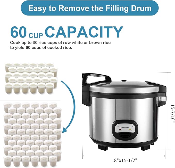 - 60-Cup Commercial Rice Cooker for Bulk Cooking: This large capacity rice cooker prepares 30 cups (180 oz) of raw rice per batch, ideal for restaurants, sushi bars, and event catering. The commercial rice cooker 60 cup model serves 50+ portions with industrial-grade efficiency.