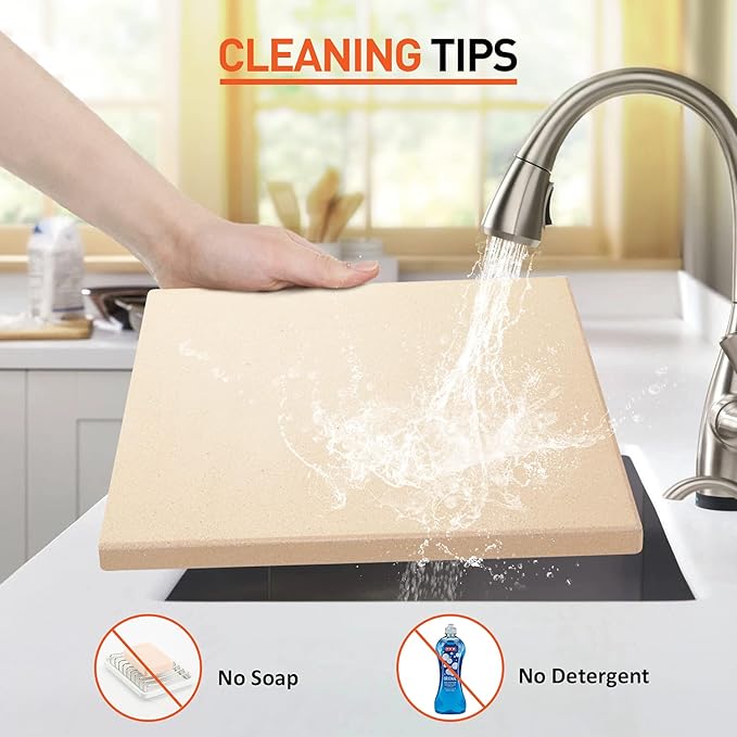 - WARM TIP - Never season pizza stone for grill with oil or grease. Never use soap or detergent to clean the stone as it may be absorbed and affect the taste of food. No dishwasher safe.