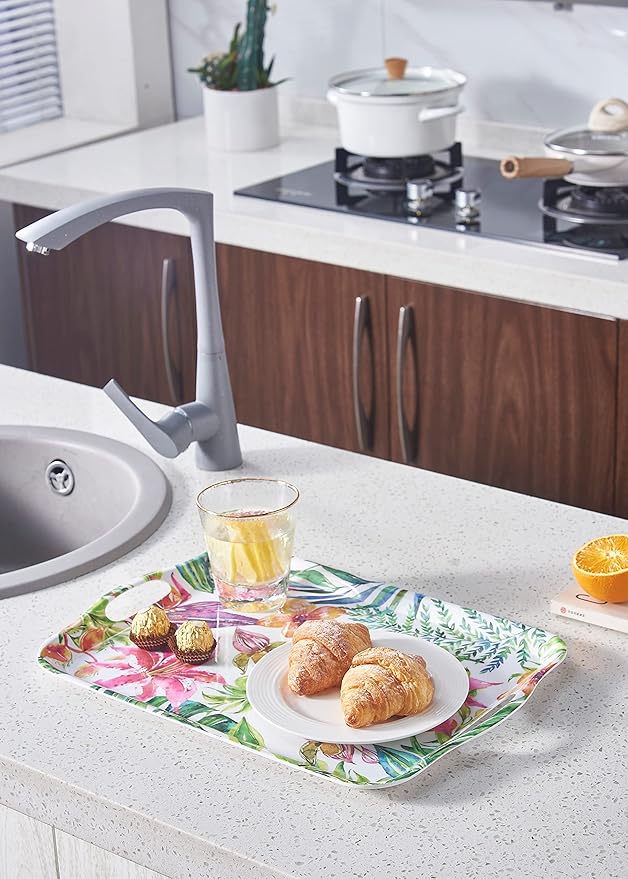 Blue Boat 16.5" x 11.5" Rectangular Serving Trays Set of 2 Floral, Light Weight Easy to Clean Sturdy Stackable Melamine Serving Tray with Handle, Fruit, Snacks, and Desserts Trays