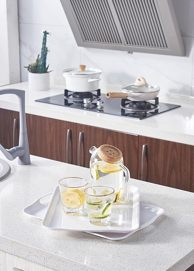 Blue Boat 16.5" x 11.5" Serving Trays Set of 2 White, Dinner Tray, Light Weight Easy to Clean Sturdy Stackable Melamine Serving Tray with Handle, Fruit, Snacks, and Desserts Trays