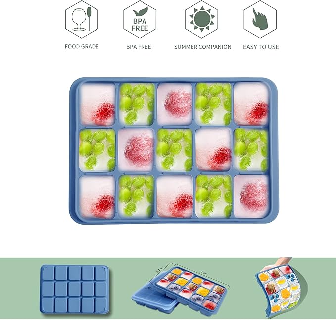 - Versatile & Convenient: Each silicone ice cube tray with lid produces 15 perfectly sized cubes, totaling 30 cubes with the set. Ideal for freezing water, cocktails, whiskey, brandy, chocolates, candies, baby food, and much more.