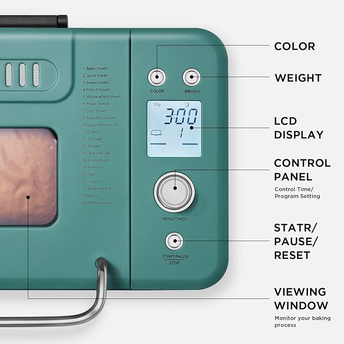 - 20 PROGRAM MENUS & 2LB LARGE CAPACITY: Our bread maker has 20 customized automatic programs(basic/ quick/ french/ sweet/ whole-wheat/ gluten-free/potato/ corn/ sugerless/ cake/ dessert/ knead/ toast dough/ pizza dough/ ferment/ bake/ jam/ yogurt/ dried meat floss/ homemade) and 3 crust colors( light/ medium/ dark) for you to choose. The loaf capacity of bread maker machine is 1.65LB and 2LB, which could serve 5~6 people at once.