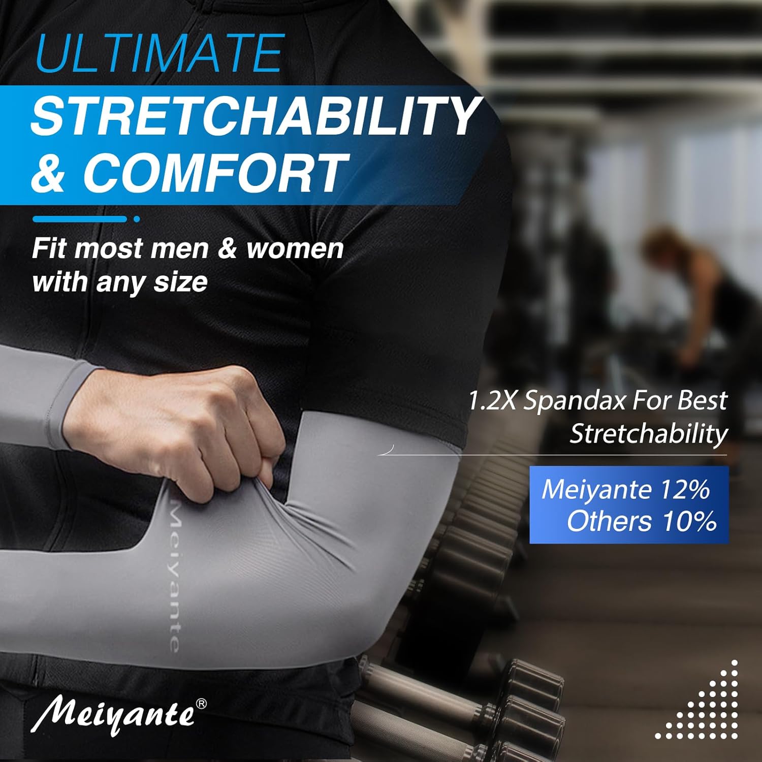 - [ULTIMATE STRETCHABILITY & COMFORT] Say goodbye to arm sleeves that cut off circulation or constantly roll down your arms with Meiyante's cooling arm sleeves for women & men. Featuring a stitchless design and DOUBLE THE AMOUNT OF SPANDEX COMPARED TO OTHER TOP-RATED ARM SLEEVES ON AMAZON, our arm sleeves provide superior stretch and comfort, making them perfect for sun protection, sports, exercise, and covering tattoos at work. Our arm sleeves ensures long-lasting wear and use.