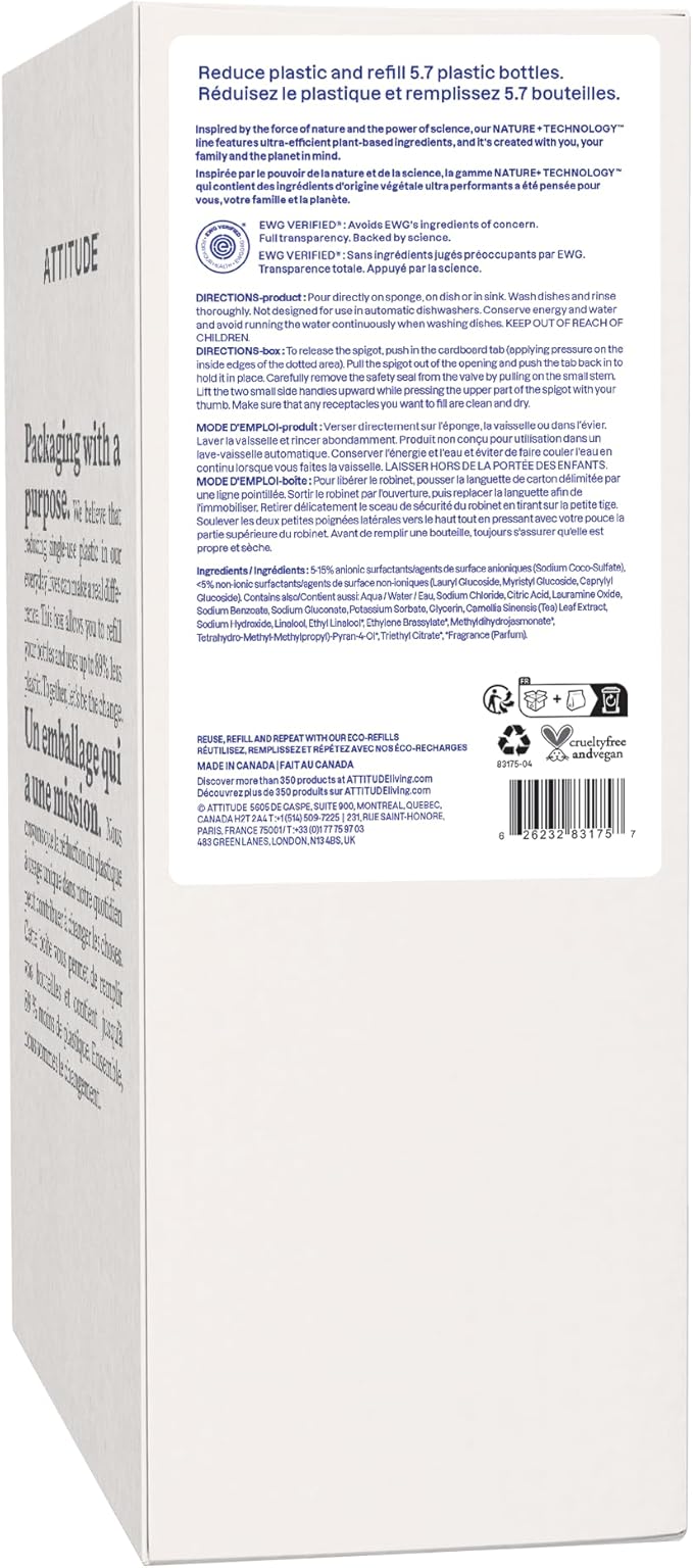 ATTITUDE Dish Soap Refill, EWG Verified, Plant-Based & Vegan Dishwashing Liquid, Naturally Derived, Olive & Coriander Scent, 135.3 Fl Oz
