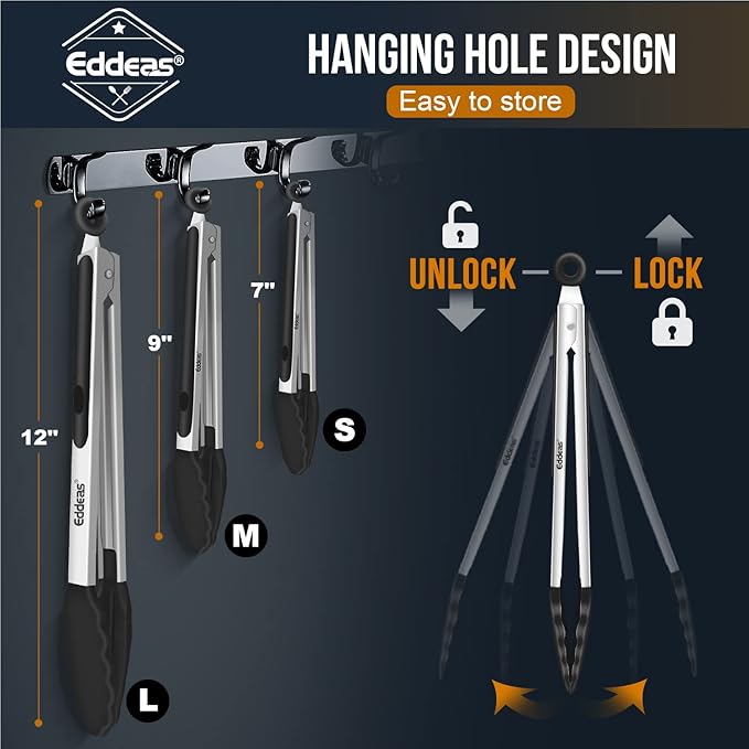 - LOCKING MECHANISM & PULL-RING TECHNOLOGY - Eddeas ring-pull technology will keep your tongs from opening and closing accidentally which will allow you to facilitate better control while using them. And can be conveniently dried and stored. the tongs easily become compact when you pull the easy pull lock up, they fit seamlessly in most drawers and cabinets for easy storage; also include a hook for easy hang