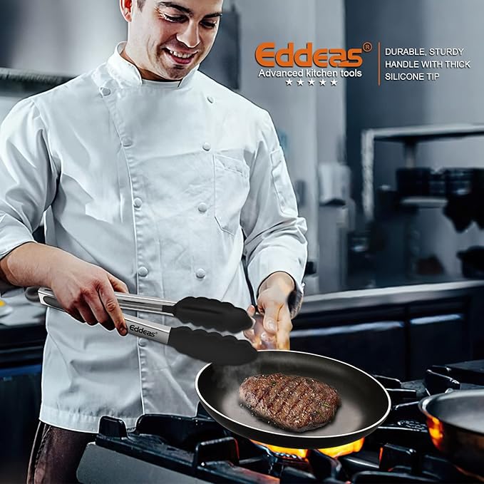 - FOOD GRADE MATERIALS - Eddeas tongs for cooking featuring a food grade silicone head, the tongs are gentle on your nonstick cookware so you can worry less about scratching and wear and tear, silicone is heat resistant up to 484 degrees Fahrenheit, making it a great option for nearly any cooking task.