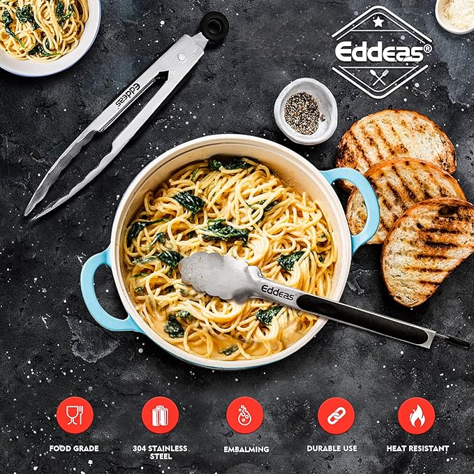 - STRUDY FOOD-GRADE STAINLESS STEEL COOKING TONGS - EDDEAS kitchen tongs for cooking are made of 1mm thick food-grade stainless steel in one piece for enhanced robustness and heat resistance, rust resistance and easy handling. The overall light weight and ergonomic features are maintained.