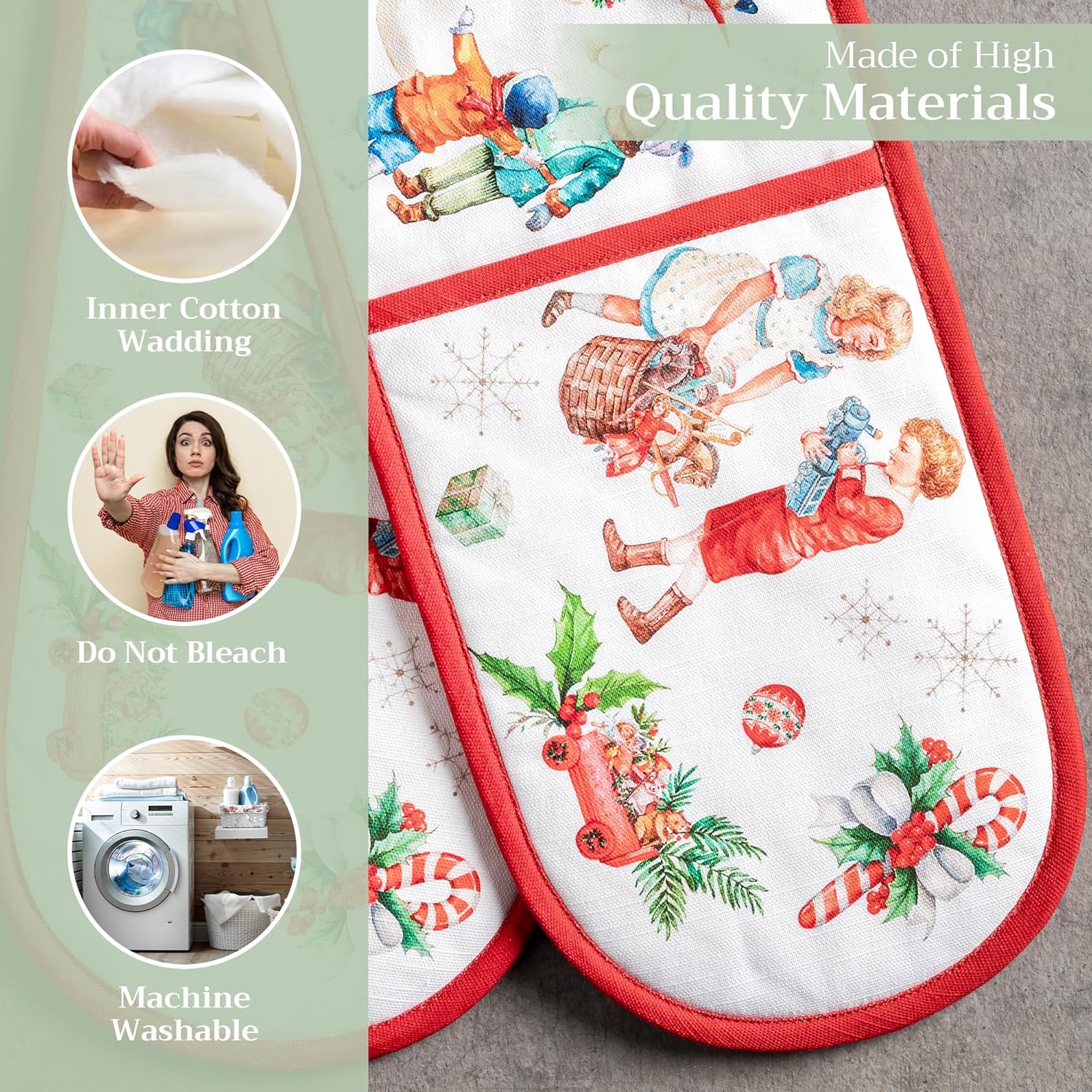 - 100% Quilted cotton: Crafted from premium quilted cotton for superior heat resistance and durability. This double oven mitt offers a soft, flexible grip and protects your hands during baking, roasting, or grilling