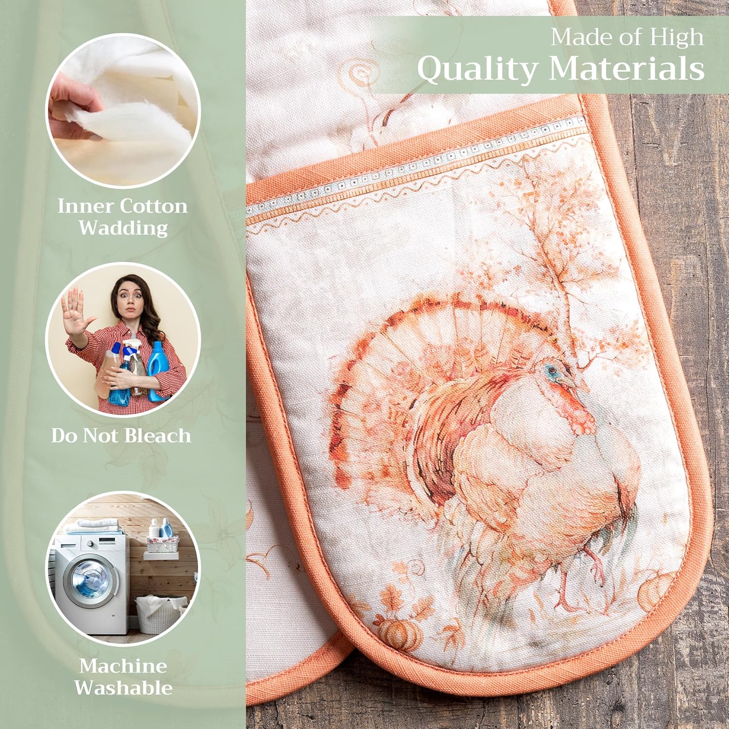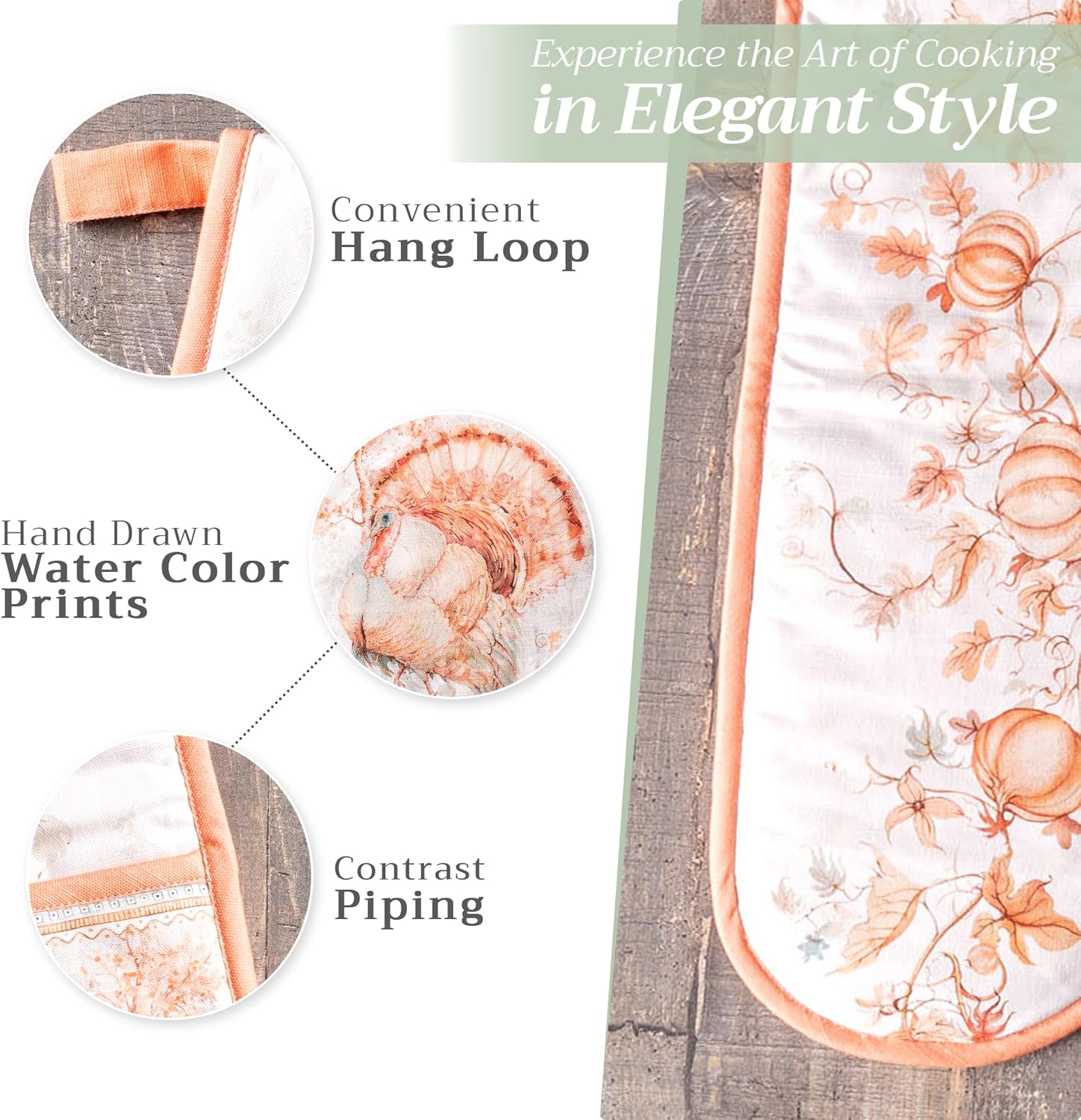 Maison d' Hermine Double Oven Mitts 100% Cotton 7"x35" Double Oven Mitt Heat Resistant BBQ Cooking Gloves with Loop, Baking, Grilling, Home, Kitchen, Handling Hot Pans (Giving Thanks)