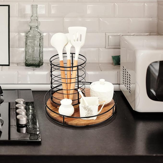 12" Acacia Wood Lazy Susan Turntable, Tomoaza Kitchen Organizer Turntable with Steel Sides, 360 Degree Lazy Susan for Countertop Cabinet or Dining Table(Black)