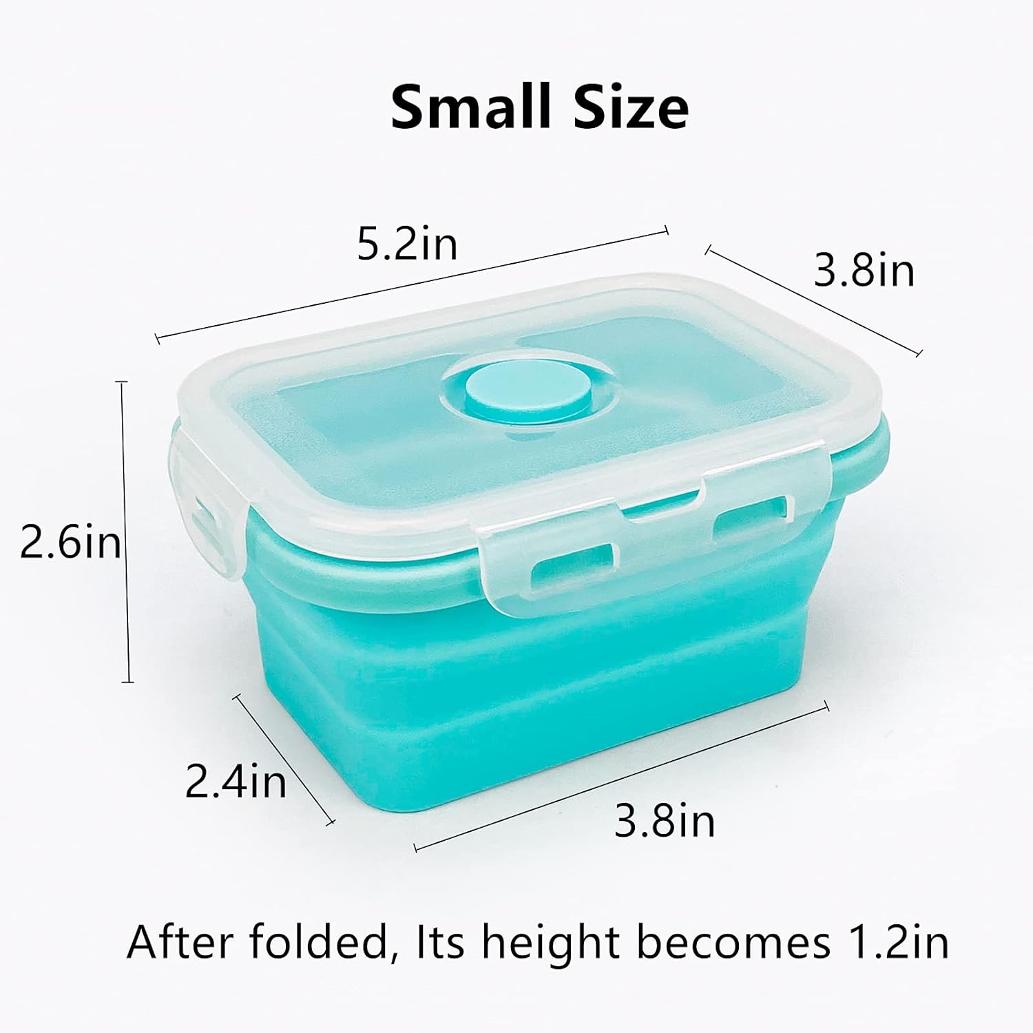 - START YOUR PORTABLE LIFE: Each collapsible food container can hold 350ml(about 12oz) food. In the expanded stage, 5.2inches(L) x 3.8inches(W) x 2.6inches(H); After collapsed, its height becomes 1.2inches. The small food container size makes them fit for storing candies, chocolates, cereals, juices, fruits, nuts, snacks, etc.