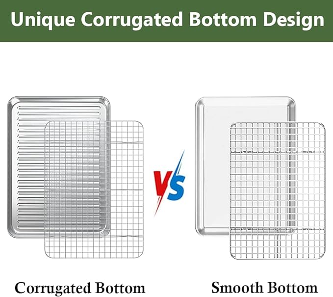 - 【Corrugated Surface】 Unique design with corrugated surface in the bottom of sheet pan, to reduce the risk of food sticking, facilitates air flow for quick release and even baking. This design also strengthen the structure to the pan for warp resistance.