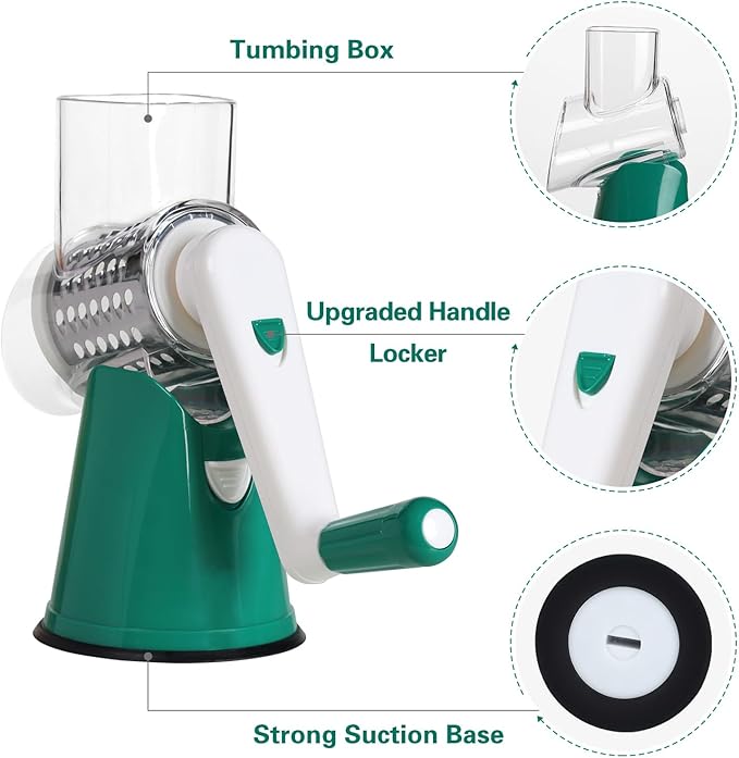 Cambom Rotary Cheese Grater Hand Crank Cheese Shredder for Fresh Cheese, Vegetable, Nuts,Non-slip Suction Base, Free Cleaning Brush Three Blades, Deep Green