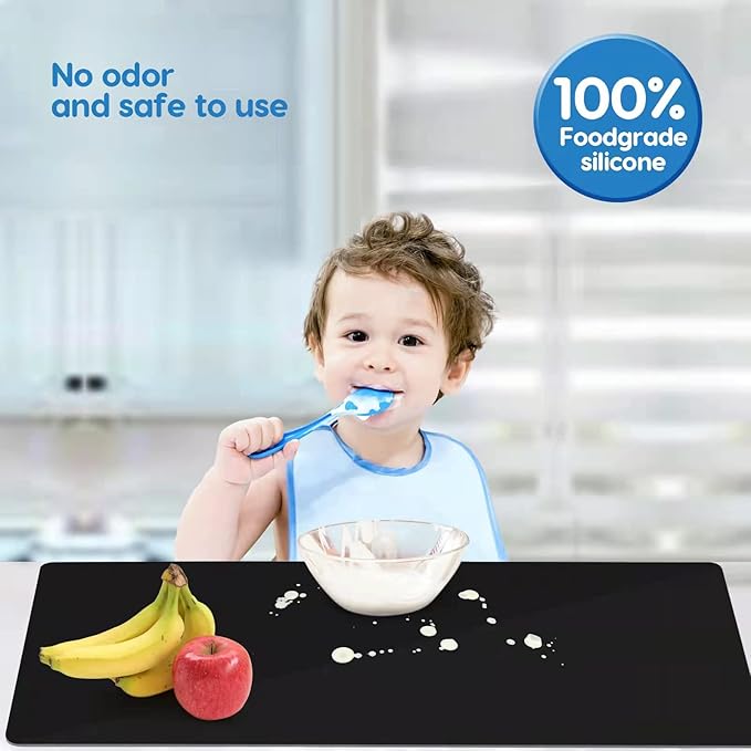 - 【WATERPROOF & ANTI-SLIP】: The smooth side face up be suggested, as it is not sticky and very easy to clean. Heat resistant silicone mats can be wiped directly with a rag and be washed with soapy water. Spilled resin/glue/paint solidification can be peeled off straightly. We suggest the side with particles face down, as the particles could hold the flat surface tight and helps contain the mess your kid makes from eating or playing.