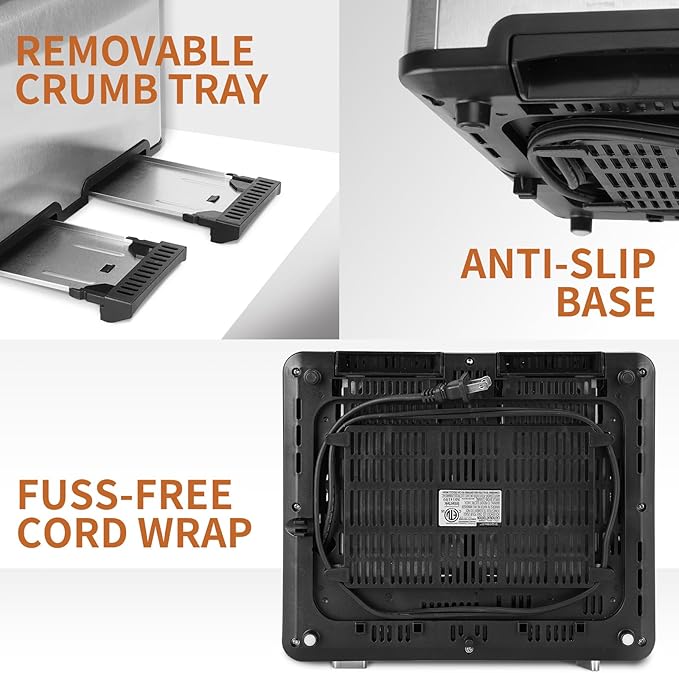 - Easy to Use: With 4-slice capacity, the breakfast toaster oven is compact and easy to clean. Removable crumb tray on both side makes cleaning could never be easier!The collectable cord storage on the bottom helps to keep your kitchen countertop tidy