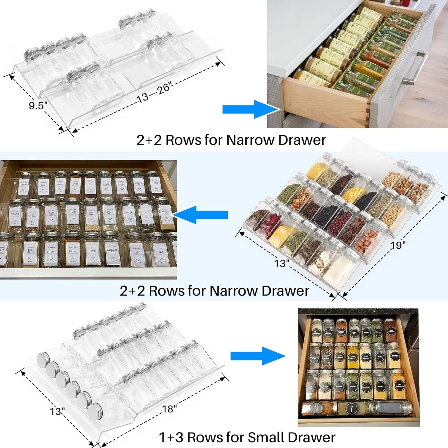 - 【2 mm Thick Food Grade Acrylic】Kitchen Spice Rack Organizers and Storage for Drawer construction with transparent 2 mm acrylic, sturdy and durable. will not yellow or rust like plastic or metal organizers. Use it to organzing spice jars, mini bottled supplement in drawer