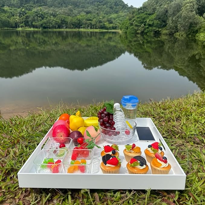 - Multifunctional: Serving tray for serving breakfast, appetizers, coffee, drinks, desserts, snacks, fruit, cheese, food; Decorative organizer tray for cosmetics, jewelry, remote, glasses, ornaments, magazines, Tray can be put on an ottoman, bed, coffee table and couch, It’s elegant to be put on any tabletop or countertop as an accessory