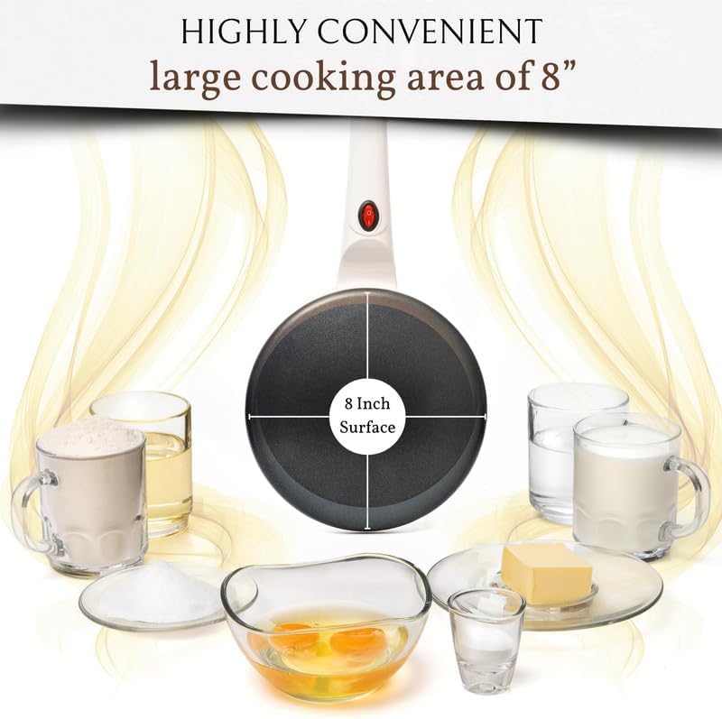 - Compact & Easy to Use: This nonstick crepe maker electric features an 8” die-cast aluminum surface that heats quick and evenly. Just preheat, dip, and flip to enjoy crepes in seconds—ideal for any home