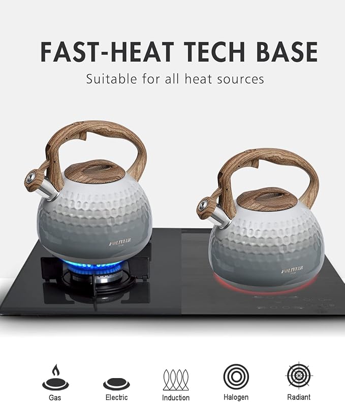 - Fast Heat Base - The tea kettle designed with a generous 8 in base can maximize the heat conduction to increase the efficiency of boiling. High grade stainless steel is suitable for any heat source including gas, electric and induction.