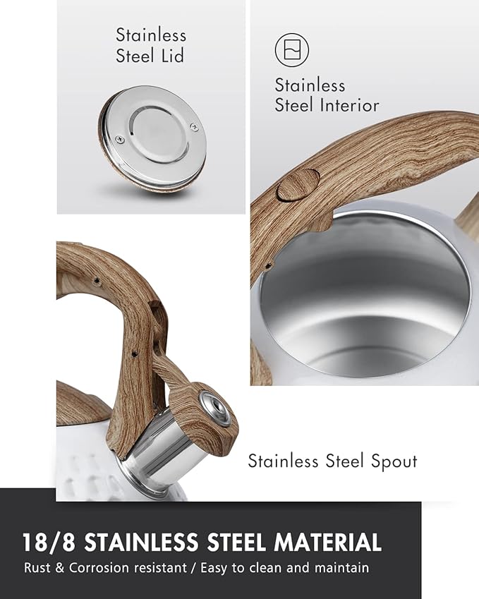 - Anti-Rust Finish - Stylish tea kettle electroplated for longevity. Professional food grade finish and 18/8 stainless steel craftsmanship, ensures this kettle is rust & corrosion resistant.