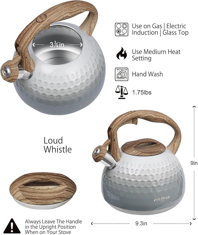 POLIVIAR Tea Kettle, Antique White Stovetop Tea Kettle 2.7 Quart, Audible Whistling Teapot, Food Grade Stainless Steel for Anti-Rust, Anti Hot Handle, Suitable for All Heat Sources (JX2020-YH30)