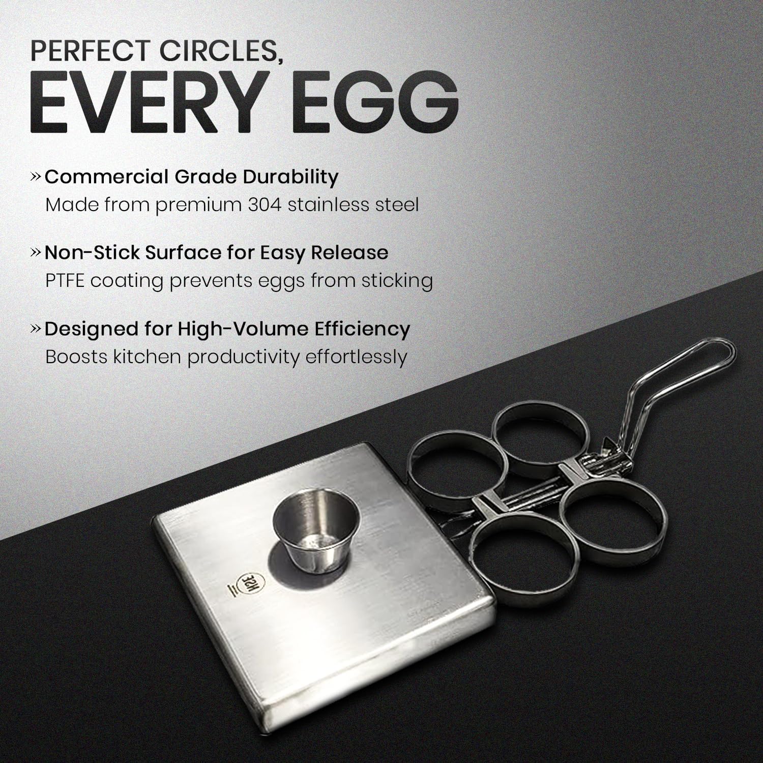 - DURABLE AND RELIABLE: Designed for daily use, our Egg Rings are made of PTFE, stainless steel powder and stainless steel, built to withstand the tough demands of commercial kitchens, ensuring long-lasting performance and dependability for perfectly cooked eggs every time.