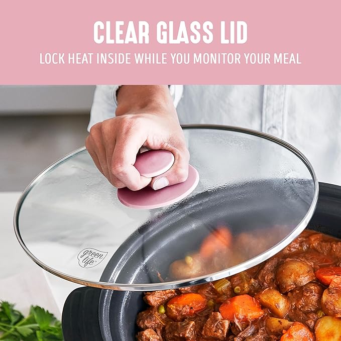 GreenLife 6QT Slow Cooker, Non-Toxic PFAS-Free Ceramic Nonstick Removable Interior Bowl, Programmable, Family Friendly, Keep Warm, Stovetop & Oven Safe, Dishwasher Safe Parts, Timer, Glass Lid, Pink