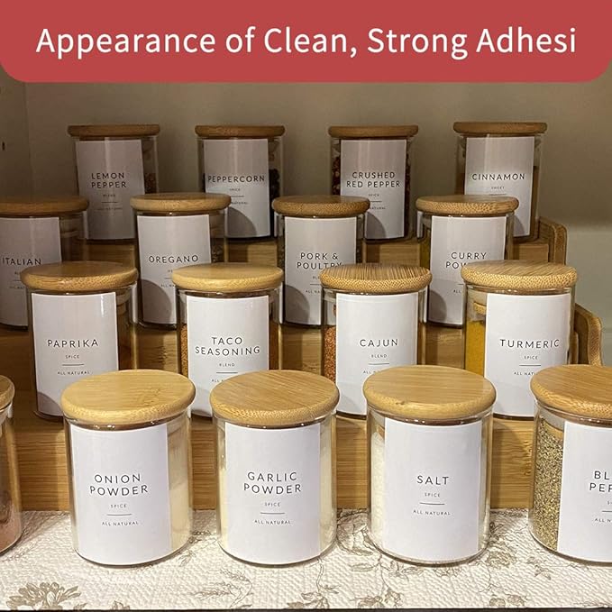 - 【MINIMALIST-WATERPROOF SPICE LABELS】Our glass spice jar labels include 131 preprinted spice labels, 9 blank labels, 8 expiration date labels. These spice stickers are high contrast for easy reading. Vinyl labels are preprinted on water resistant white matte backing that won't peel off or tear, can be removed and replaced. Perfect fit 6oz spice organizer jars.