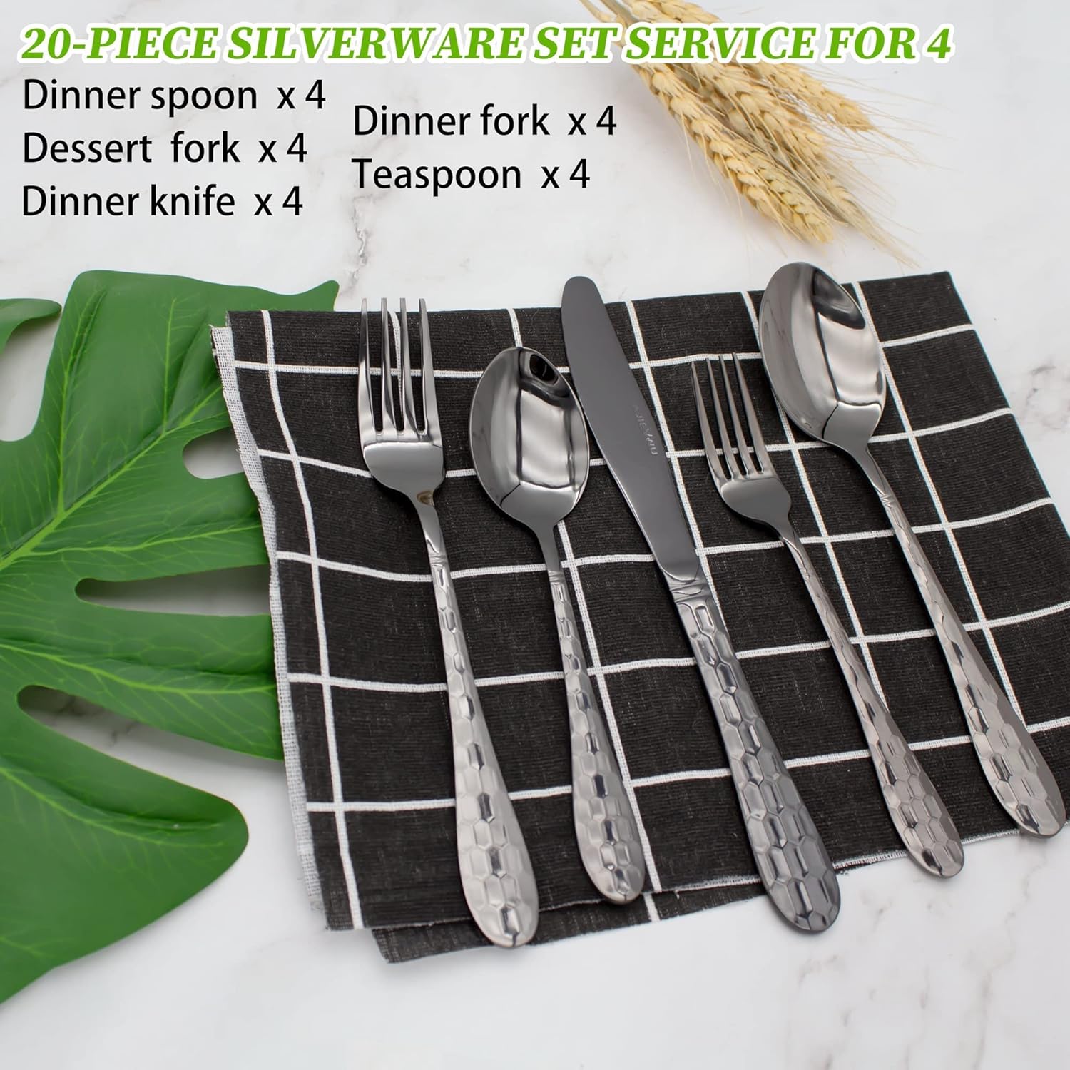 - 🌟🍴【20 PCS SILVERWARE SET SERVICE FOR 4】This silverware set includes 4 dessert fork, 4 dessert spoons, 4 dinner forks, 4 dinner spoons, and 4 dinner knives, 20 pieces silverware set can satisfy most family of 4 people and provide sufficient quantities for the guest.Dishwasher safe eating utensils.