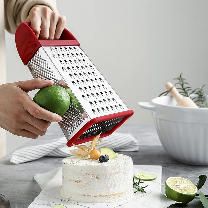 - Incredible Versatility With The 4 Sided Design Kitchen Grater: Coarse grating, Medium grating, Fine grating/Zester and even a Slicer - all in one convenient tool. Quickly prep an array of foods like cheese, parmesan, potato, squash, zucchini, carrots, lemons and cucumbers. Multi-functional with a comfortable handle that gives you total control.