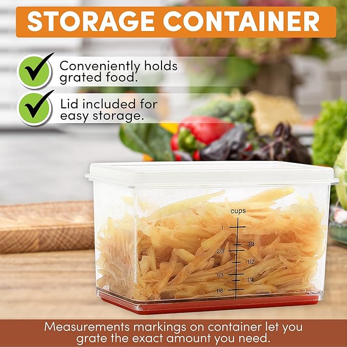 - Included Storage Container With Lid: The included storage box lets you grate directly into the container and store it with the lid. The container also has measurement markings on the side so you can get the perfect amount.