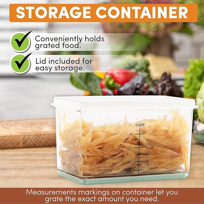 - Included Storage Container With Lid: The included storage box lets you grate directly into the container and store it with the lid. The container also has measurement markings on the side so you can get the perfect amount.