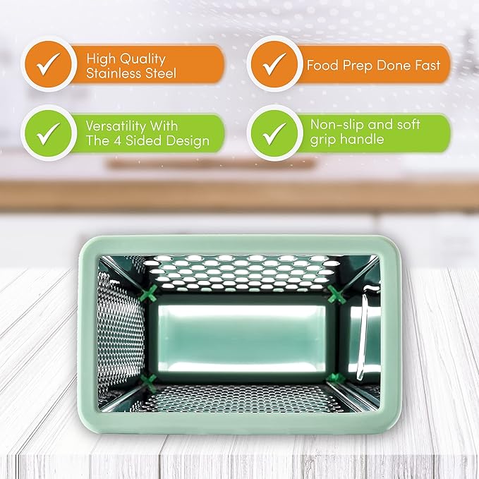 - Incredible Versatility With The 4 Sided Design Kitchen Grater: Coarse grating, Medium grating, Fine grating/Zester and even a Slicer - all in one convenient tool. Quickly prep an array of foods like cheese, parmesan, potato, squash, zucchini, carrots, lemons and cucumbers. Multi-functional with a comfortable handle that gives you total control.